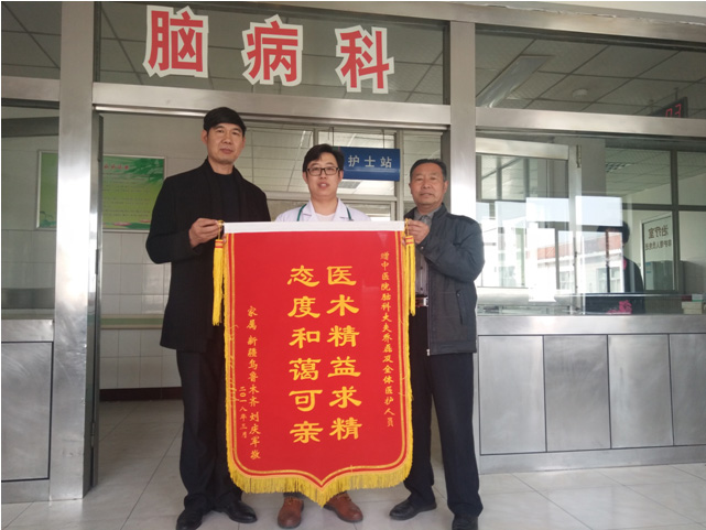 患者住院第二日,长期居住于新疆乌鲁木齐的儿子刘先生赶到医院,见到老母亲偏瘫在床的样子非常心疼,与乔磊医师交流后嘱一定尽全力救治患者。脑血栓患者前期病情不稳定,家属与医生前期都比较害怕的问题就是患者病情加重,通过采取中西医结合的综合治疗,第二天查房时病情较入院无明显加重,略见好转,家属与医生紧张的心情得以稍稍放心,交代患者家属,嘱患者多饮水。鉴于患者病情稳定,第二天便给予针灸、康复等中医特色治疗,以助患者偏瘫侧肢体功能恢复,家属亦积极配合治疗。后期查房患者右侧肢体偏瘫症状逐渐好转,入院时右侧肢体不能活动,住院7天时右侧肢体活动基本恢复正常,可在家人搀扶下下床活动,病情明显好转。继续住院治疗至2周时,右侧肢体偏瘫症状基本消失,生活完全自理。家属对治疗效果非常满意,激动心情溢于言表,患者其子刘庆军先生为表达谢意,特送乔磊主治医师及脑科全体医护人员锦旗一面表达心意。乔磊医师代表同事们也感谢患者家属的信任和积极配合,祝老人早日恢复健康。