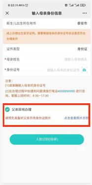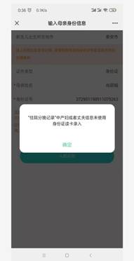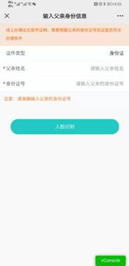 ① 手动输入母亲姓名和身份证号点击人脸识别(去核验是否符合线上办理的条件)