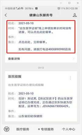 ② 审核通过后,母亲会在自己的健康山东公众号收到审核通过的提醒及快递单号。
