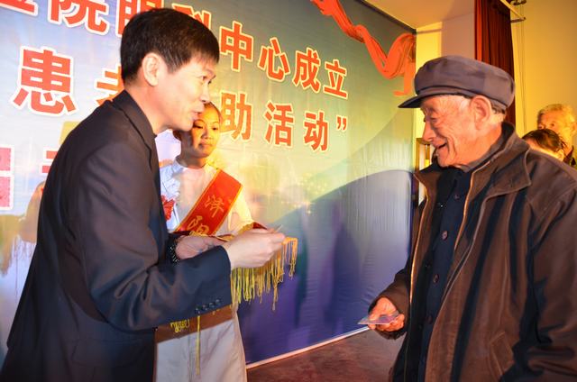院长孟庆传现场向200名困难群众发放了爱心救助卡,持卡患者将于近期在我院免费接受白内障微创复明手术治疗。